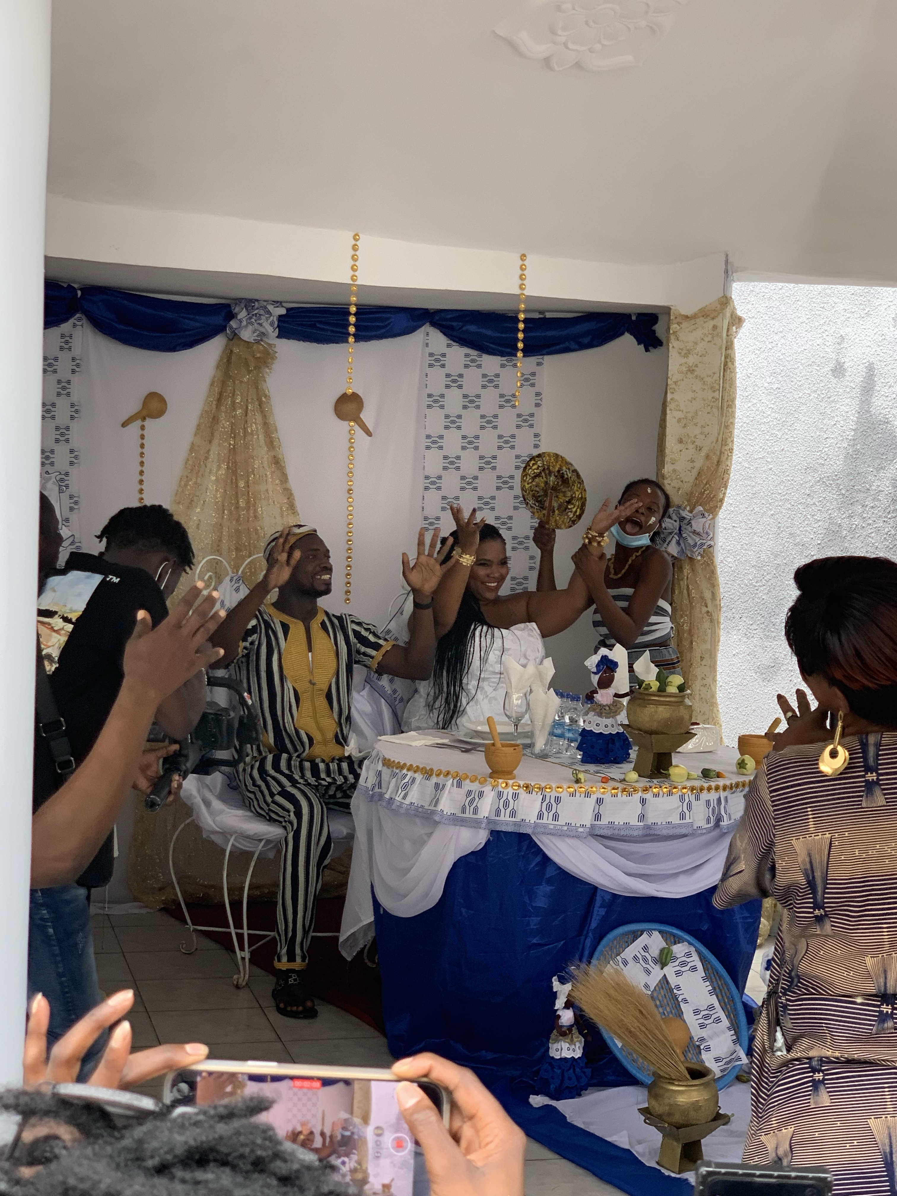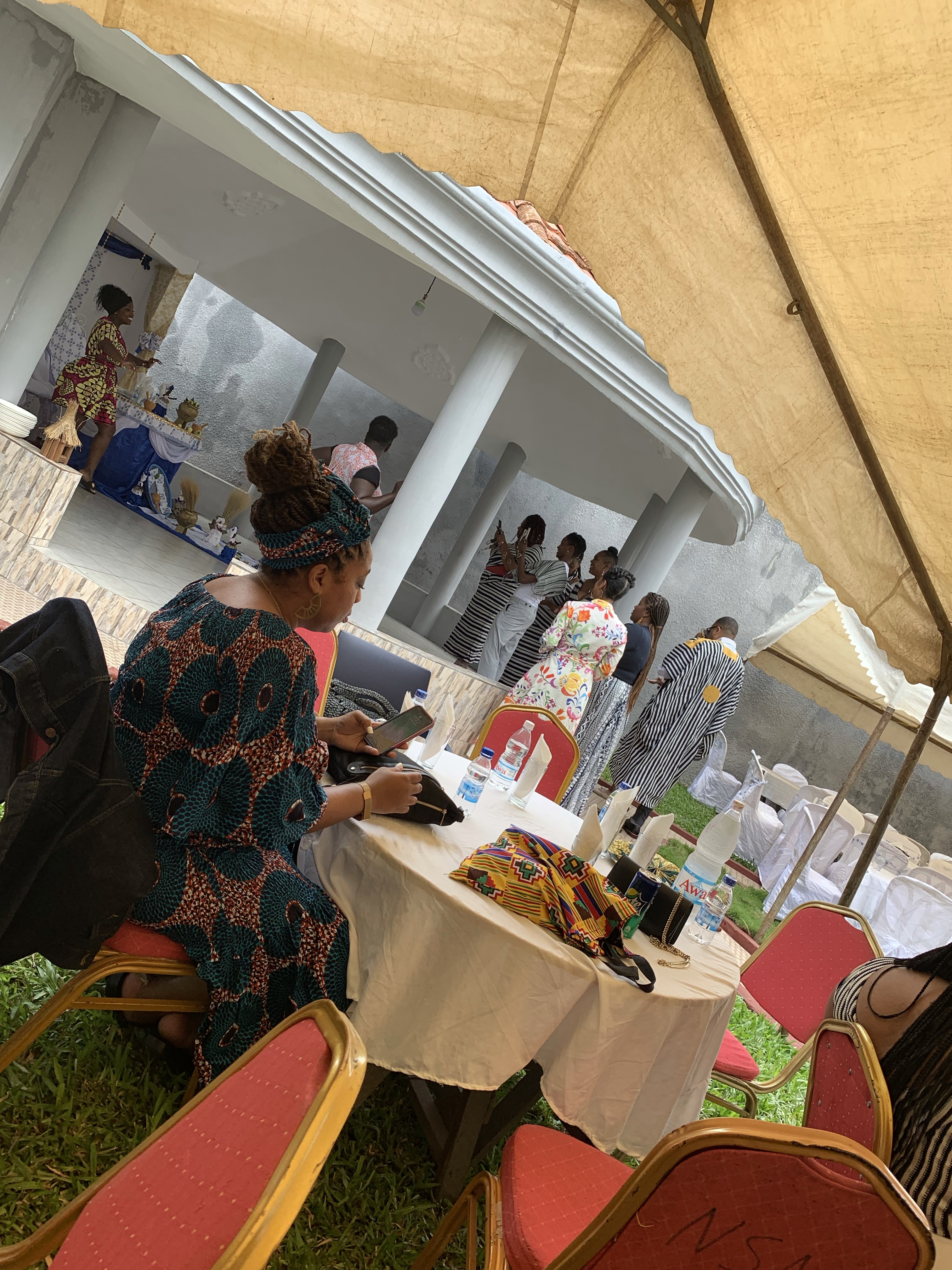 I would later find out, as the guests sat and waited, the families were inside carrying out African traditions. There was a formal greeting of the families by the elders, an exchanging of gifts and a game of “who is my wife” played by the bridesmaids on the husband. With this game, The bridesmaids would take turns being completely covered in fabric. They would be brought to Guy and he would have to determine if it was his wife or not. Rumor has it, he was NOT up (“where is my WIFE”) for the games…at all. I hear that there was only one women covered, usually it’s 3 or 4…lol. I only have a few pics from inside the house but, it looked like a good time. Thank you to the group chat for the extra pictures!